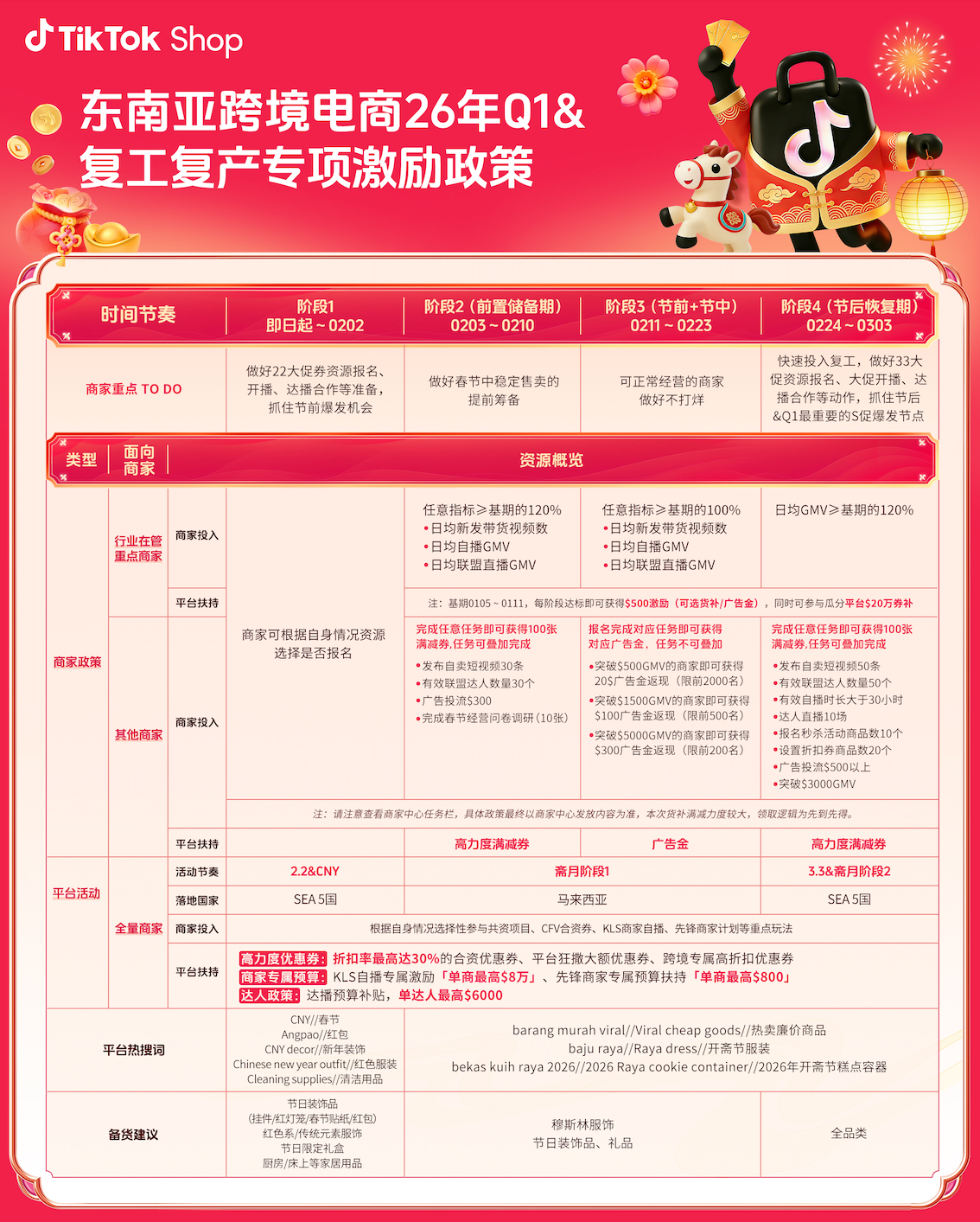本次专项激励福利丰厚,针对不同类型商家提供分层权益:行业在管重点商家完成指定 GMV、直播等任务,可获得$500激励,更有机会参与瓜分平台$20万券补;其他商家完成短视频发布、广告投流等任务,即可解锁满减券、广告金等多重补贴,把握增长机遇。