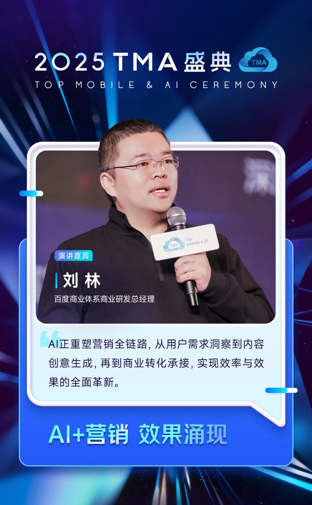 百度商业体系商业研发总经理 刘林带来了主题演讲“AI+营销 效果涌现”,他表示:AI深度融入用户生活与企业营销,用户在日常、工作、娱乐等多场景高频使用AI;企业营销渗透率已近80%,文案、数字人、视频制作等成为核心应用。百度依托大模型技术,通过新搜索、擎舵AIGC创意平台及数字人应用,以更丰富的搜索展现、更逼真的创意内容、更专业的智能承接,推动营销效果全面革新。