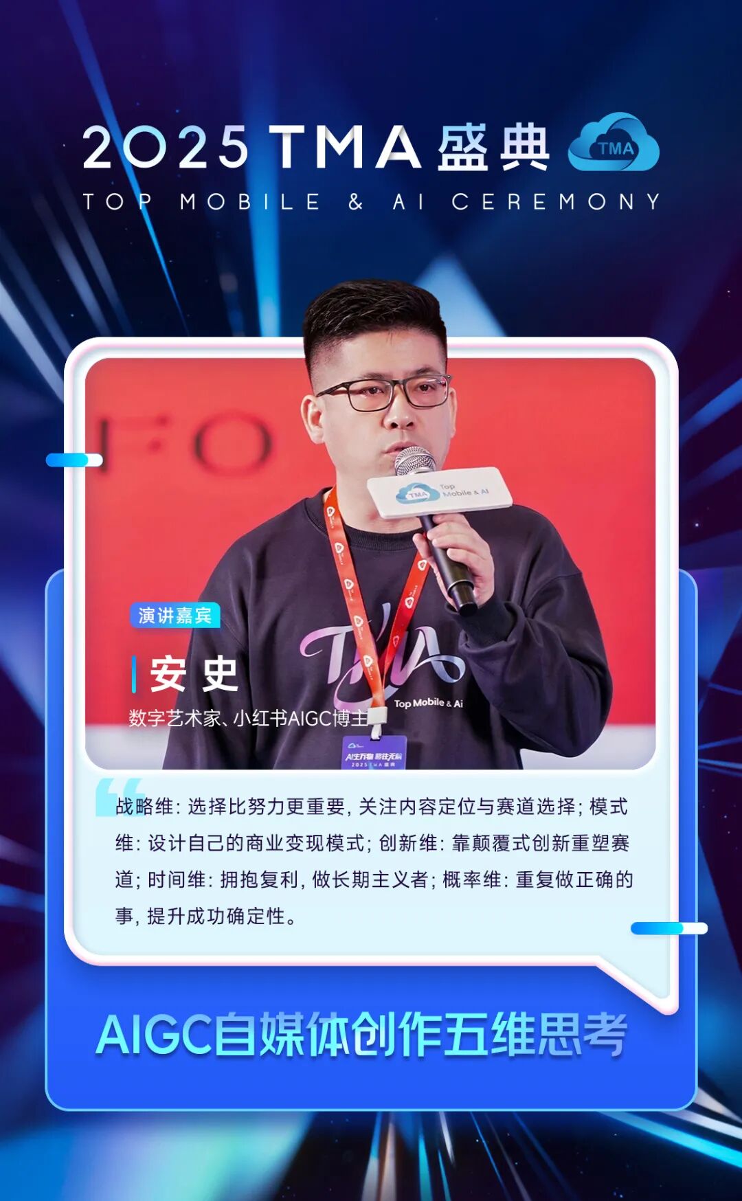 数字艺术家、小红书AIGC博主 安史在“AIGC自媒体创作五维思考”中表示,AIGC时代,创作者应通过“升维思考”系统性构建核心竞争力——战略维:选择比努力更重要,要核心关注内容人设与赛道选择;模式维:设计专属于自己的商业变现模式;创新维:通过颠覆式创新重塑赛道;时间维:拥抱复利,做长期主义者;概率维:重复做正确的事,提升成功确定性。