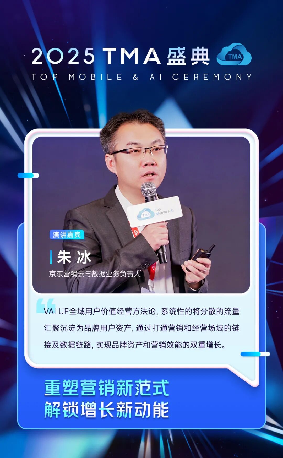京东营销云与数据业务负责人 朱冰带来了主题演讲“重塑营销新范式,解锁增长新动能”:面临品牌增长需求从性价比转向心价比、流量从重规模转向重质量、品牌从重传播转向重信任,京东提出“VALUE全域用户价值经营方法论”,通过数智与AI技术驱动,整合品牌分散的营销资源,以覆盖用户全链路精细化运营,沉淀高价值用户资产,最终实现品牌力与经营力协同增长。