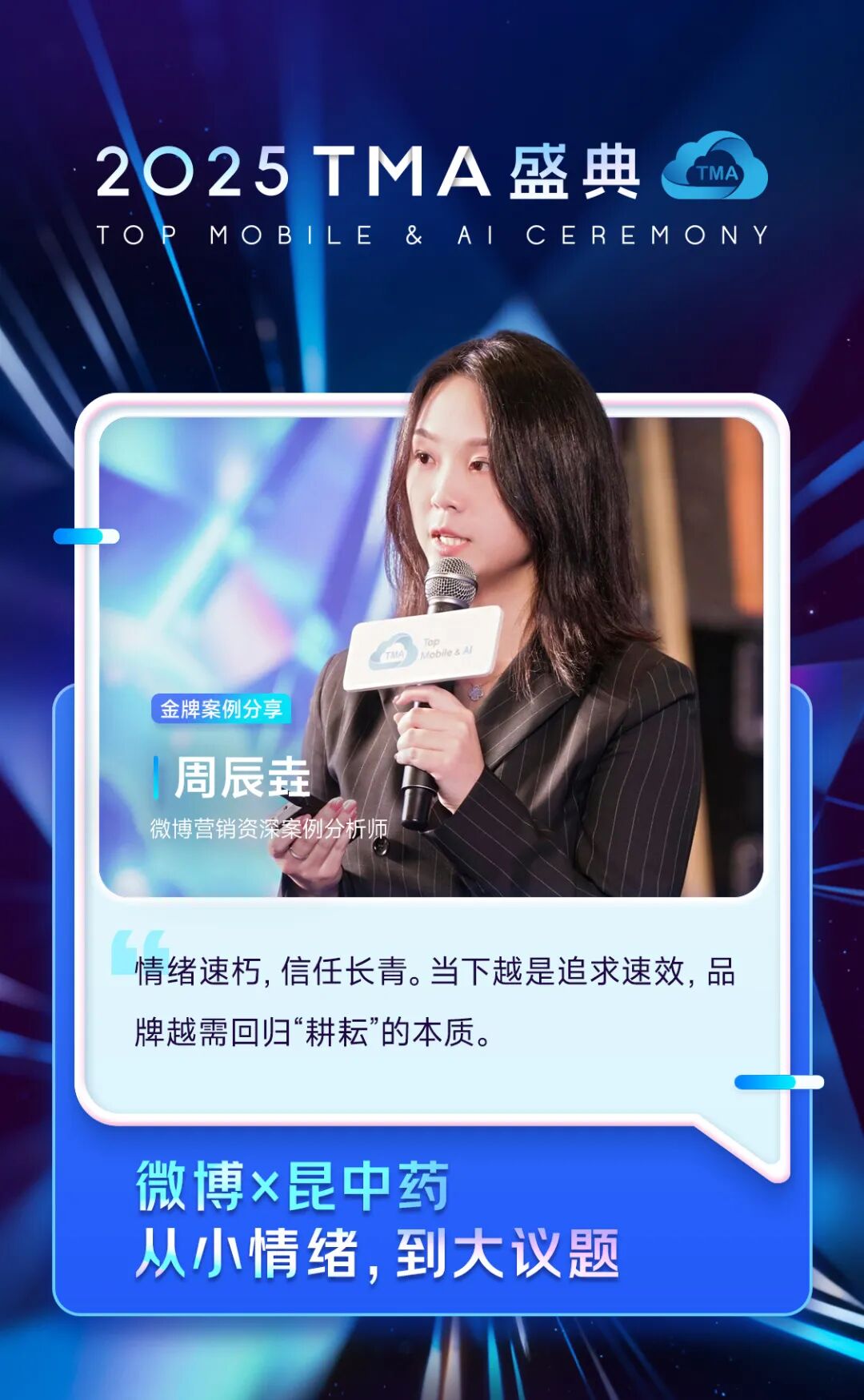 微博营销资深案例分析师 周辰垚分享了金奖案例《微博×昆中药:从小情绪,到大议题》,新情绪消费时代,情绪健康成为用户构建内心秩序的重要一环。面对OTC品类决策门槛高、信任建立慢的挑战,昆中药联合微博选择深耕“信任”这门慢功夫。通过聚焦“职场情绪早期调理”这一具体场景,以公益行动引发共鸣,以专业科普建立共识,以长期对话温暖陪伴,将品牌融入用户真实生活。情绪速朽,品牌唯有基于专业与共情的长期价值交付,才能将每一次沟通沉淀为用户心中坚实的信任资产。