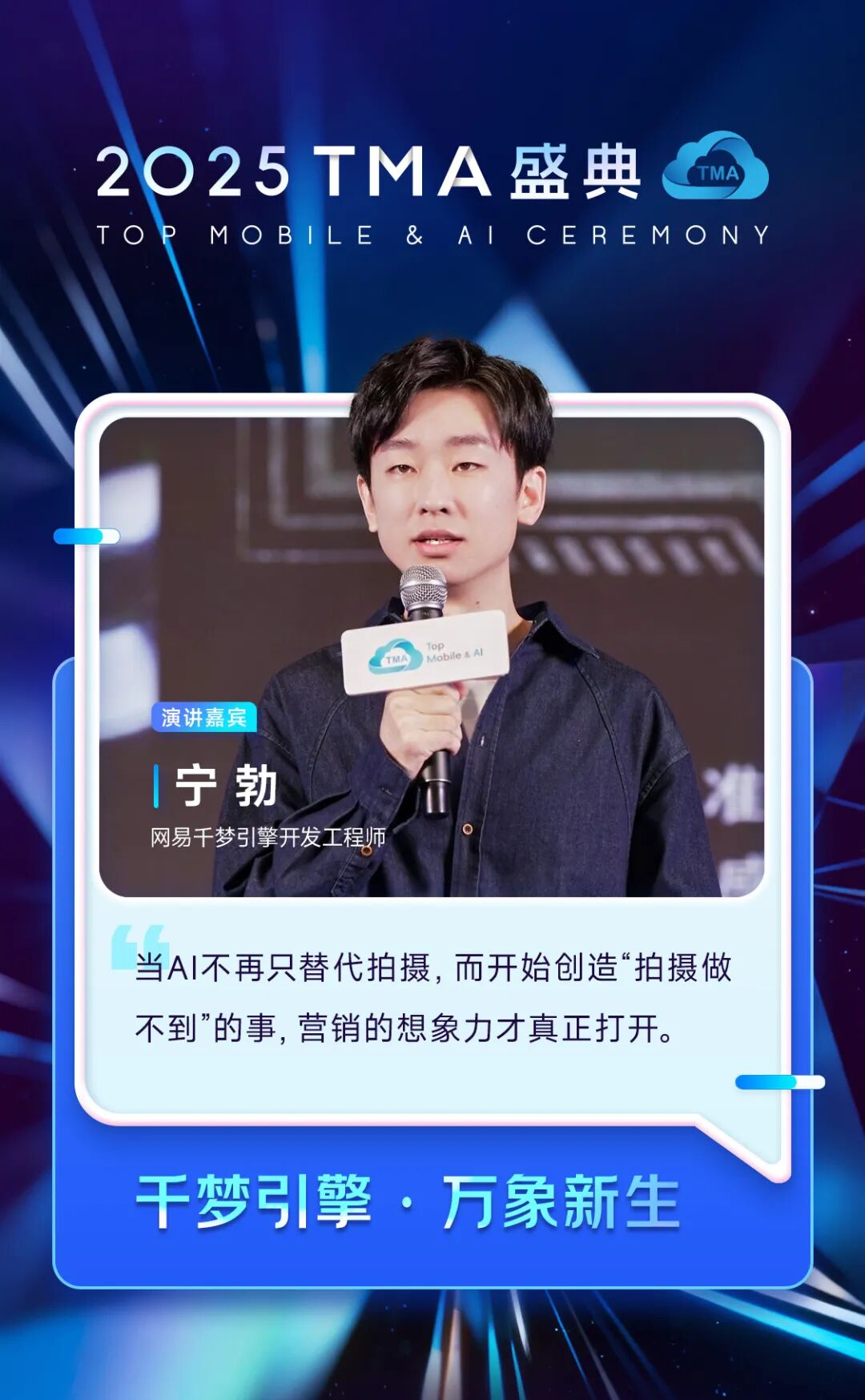 网易千梦引擎开发工程师 宁勃分享了“千梦引擎·万象新生”,他认为,在AI重塑内容营销的当下,面对高频更新与产能不足的核心挑战,网易传媒千梦引擎提供系统化解决方案。聚焦三大实战场景:一是激活存量,让传统互动内容焕发新生;二是效率革命,通过虚拟IP与标准化工程,实现视频的规模化量产;三是创意破界,借助数字分身等前沿技术,创造前所未有的内容体验,从而将AI转化为切实的内容竞争力。