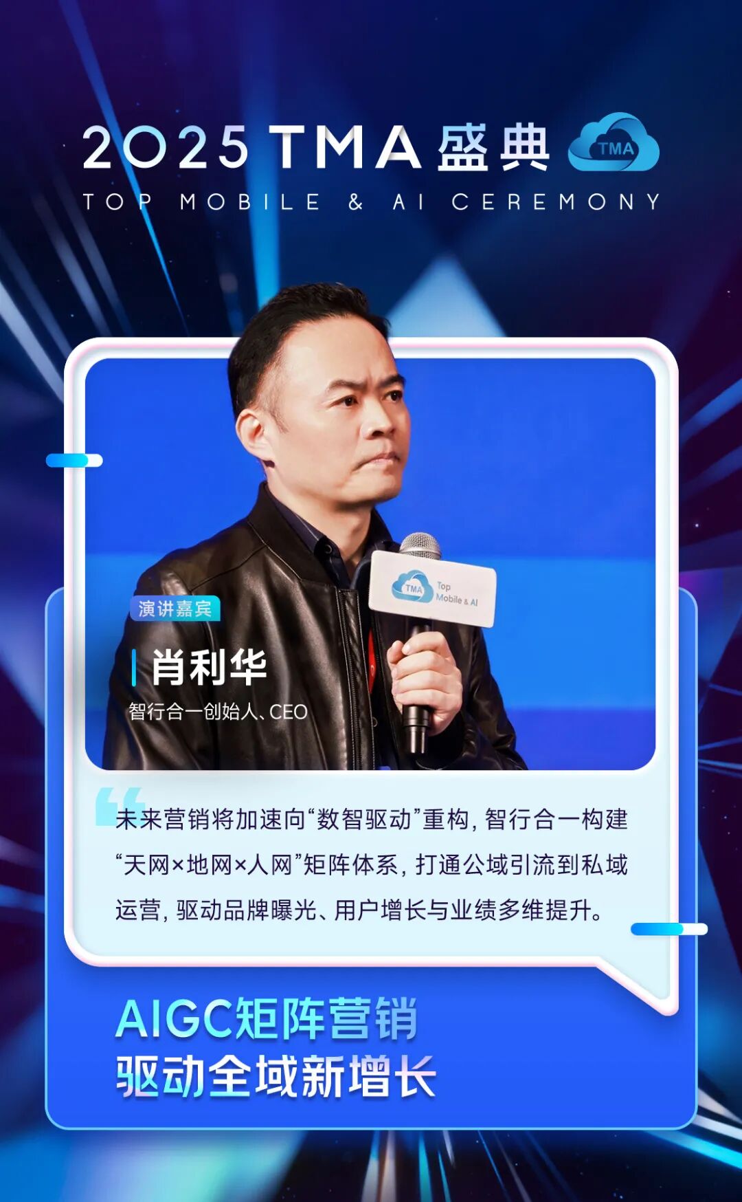 智行合一创始人、CEO 肖利华在开场演讲“AIGC矩阵营销驱动全域新增长”中表示,未来营销将加速向“数智驱动”重构,面对企业门店客流、成本等增长难题,低成本获客是所有商家的核心诉求。智行合一构建“天网×地网×人网”矩阵体系,整合数据、算力与算法,赋能企业实现全域、全链路、全要素的数字化运营。凭借智碰宝、视频宝等AI工具实现内容高效生产与分发,多平台账号矩阵构建,打通公域引流到私域运营,驱动品牌曝光、用户增长与业绩多维提升。