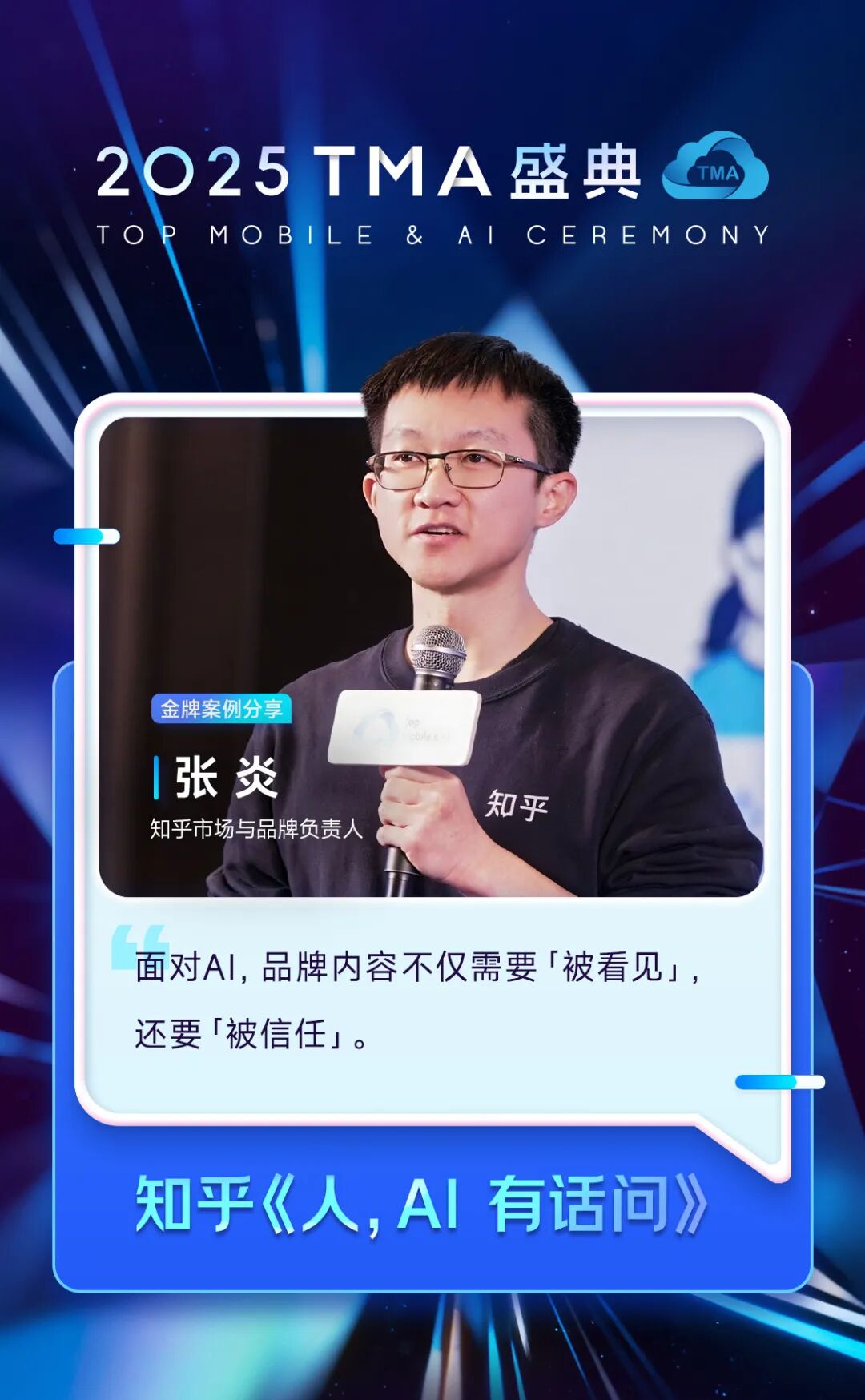 知乎市场与品牌负责人 张炎分享了金奖案例《人,AI 有话问》,他认为,AI不仅正在重塑用户搜索行为,也在推动用户决策进一步转向“人机协同”。未来,在AI智能体全流程决策的时代,AI将成为“终极的怀疑论者”,对一切信息交叉验证真伪。因此,品牌营销的核心需要从传统的“说服”转向“证明”,提供更加有深度、可被验证的高价值内容。