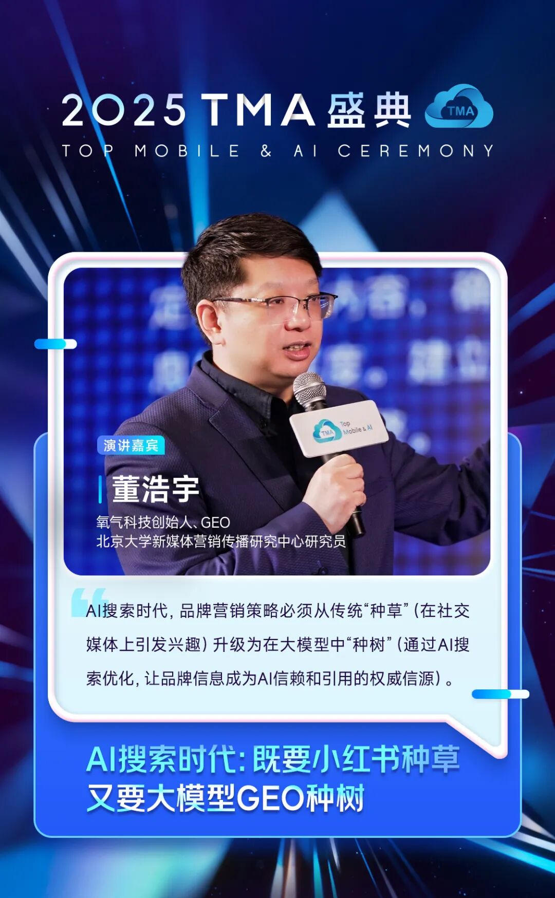 氧气科技创始人、GEO&北京大学新媒体营销传播研究中心研究员 董浩宇分享了“AI搜索时代:既要小红书种草,又要大模型GEO种树”。他表示,AI搜索时代,消费者行为从传统搜索转向AI驱动的发现之旅,决策路径变为“AI搜索-社交验证-电商购买”。如何优化品牌在AI搜索结果中的可见度与信任度?GEO的核心即“用算法拥抱算法”,通过智能体进行算法洞察和诊断、创意优化与传播管理,帮助品牌在社交媒体中“种草”,并在大模型GEO建立更长期、可信的存在,实现“种树”。