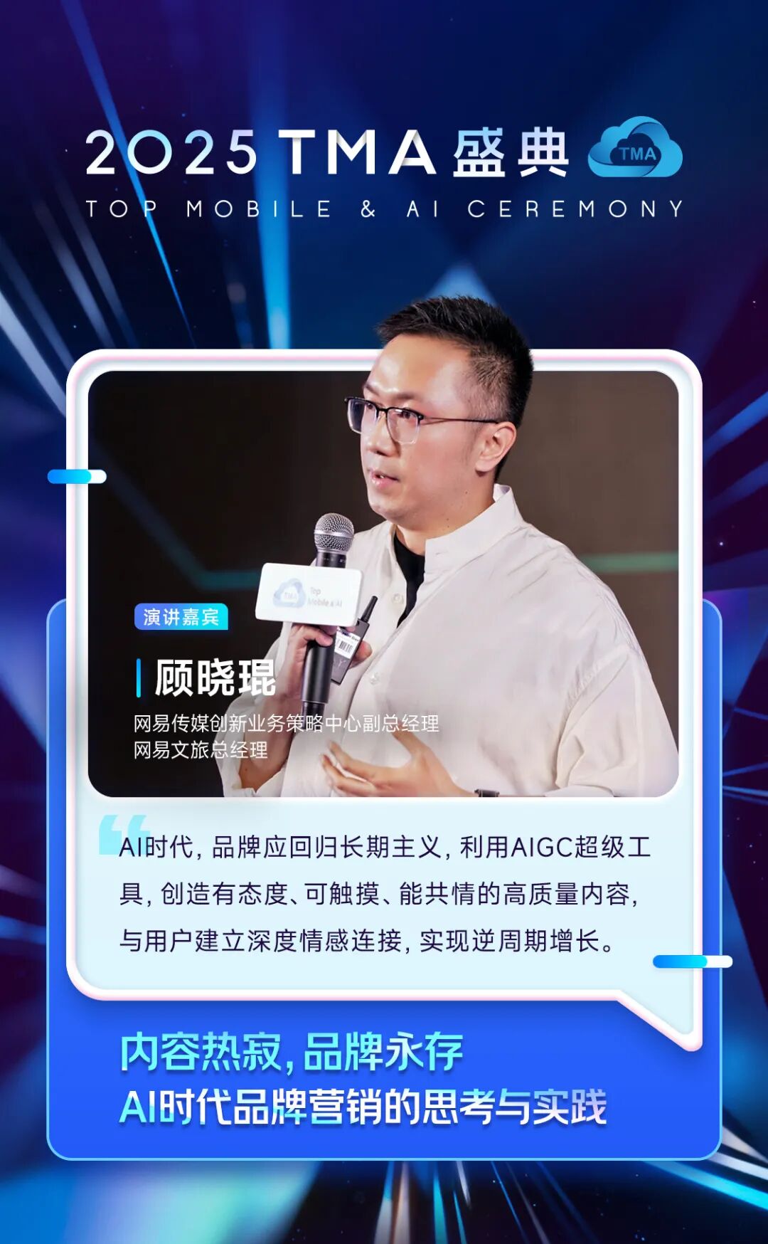 网易传媒创新业务策略中心副总经理、网易文旅总经理 顾晓琨在“内容热寂,品牌永存:AI时代品牌营销的思考与实践”中表示,当下,AI正在重写内容的生产方式,我们正进入一个前所未有的“流动性”时代。一切都在加速,也在被稀释。网易作为一家穿越周期的内容公司,我们既身处内容产业的变革浪潮之中,也在用自身的实践证明好内容依旧稀缺,也能够持续为品牌带来增长,让我们重新理解AI浪潮下内容和品牌的关系,共创面向未来的品牌营销之道。