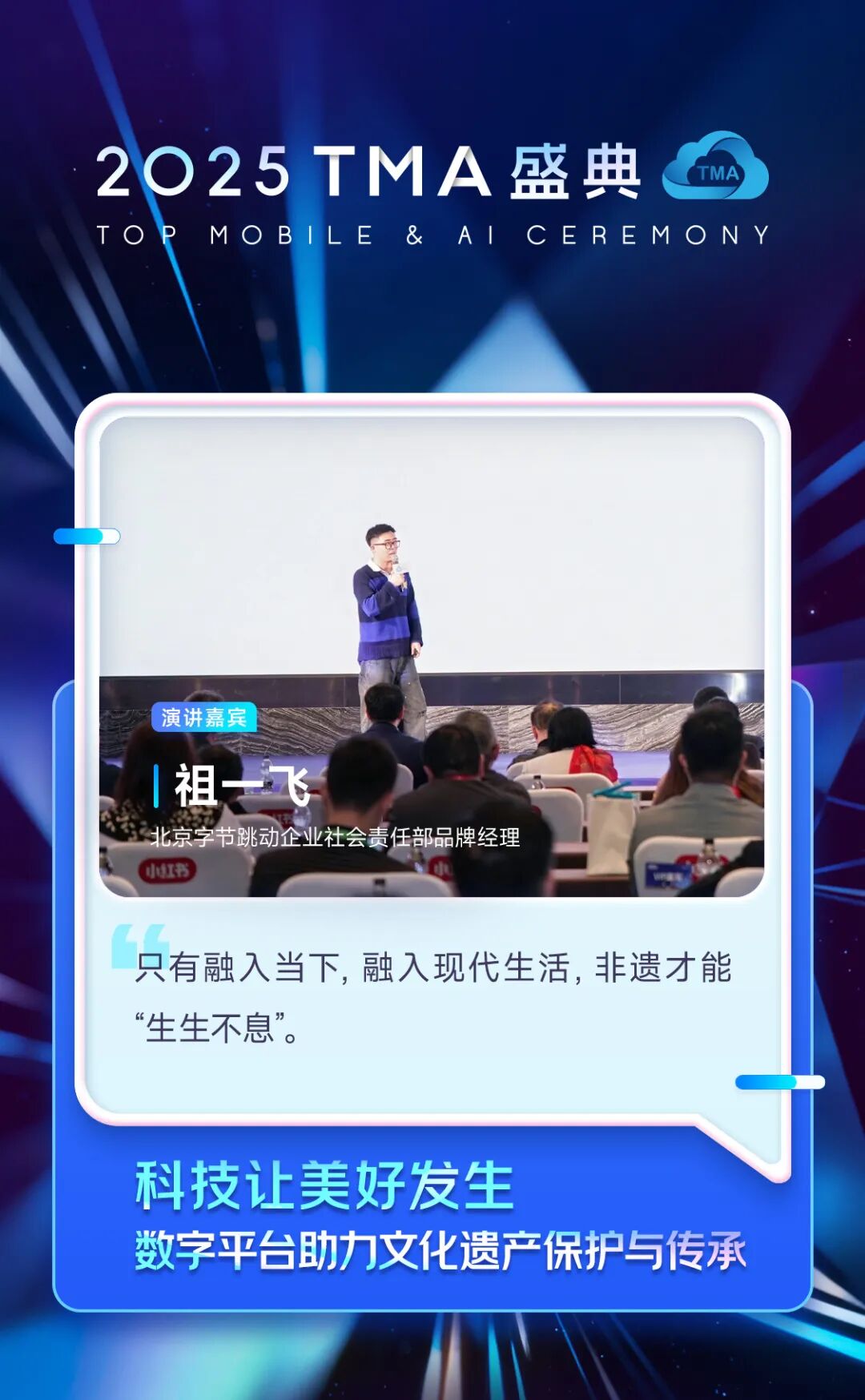 北京字节跳动企业社会责任部品牌经理 祖一飞带来了主题演讲“科技让美好发生,数字平台助力文化遗产保护与传承”,他强调,文化遗产是中华民族的宝贵财富,其价值不可估量,并在代代相传中与时代融合发展。字节跳动作为一家有社会责任的科技企业,有能力,也有责任参与文化遗产的保护传承工作。无论是非物质文化遗产,还是古籍等物质文化遗产,字节跳动都相继开展有针对性的公益举措。我们希望发挥自身的科技能力和平台优势,助力文化遗产获得新生、走向大众,在延续中华文明的同时,更好地发挥出当代价值。