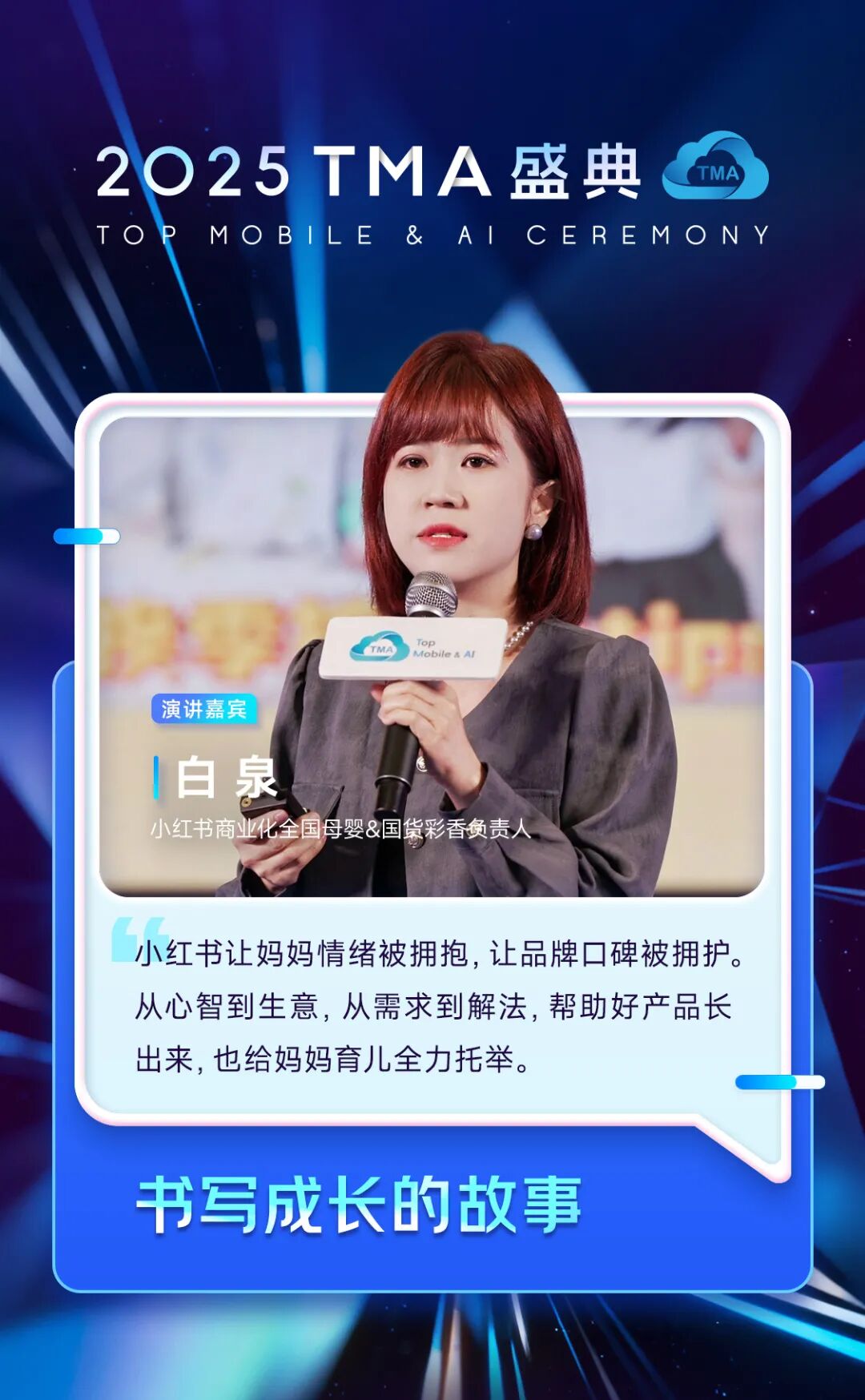 小红书商业化全国母婴&国货彩香负责人 白泉分享了“书写成长的故事”,她说,小红书已成为当代宝妈育儿养娃的主阵地。基于对新手妈妈、敏宝妈妈等八类细分人群需求的精准理解,小红书深度洞察人群需求与情绪,将母婴产品功能卖点转化为用户情感买点,通过场景化内容、人格化沟通与全域融合的体验式种草,帮助母婴品牌实现从种草到口碑经营的增长闭环。